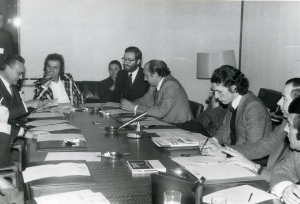 En una mesa redonda sobre la industria fonográfica junto a Luis Sagi-Vela, Mateo Fortuny, Valentín Pardos, Antonio Villegas, Francisco Verdú y Enrique Martín Garea.