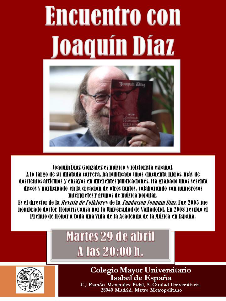 El próximo martes 29 de abril a las 20:00 horas tendrá lugar un encuentro con Joaquín Díaz en el Colegio Mayor Universitario Isabel de España de Madrid, durante el que hablará sobre su trabajo y la Fundación, entre otros aspectos.