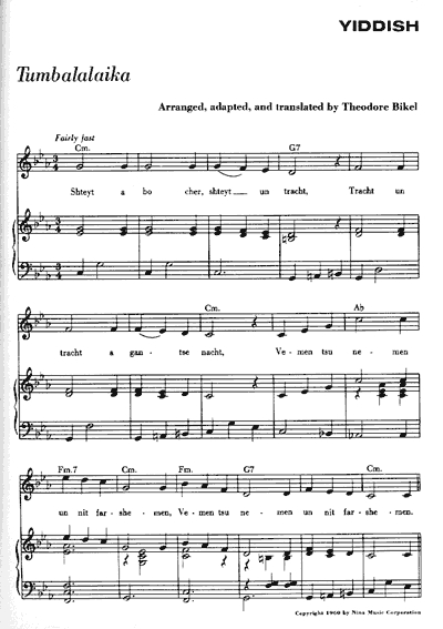 El tema interpretado, «Tumbalalaika«, se incluía en el repertorio habitual de Theodore Bikel, actor de origen austríaco y cantante del repertorio folclórico hebreo nacido en 1924. Podéis escucharlo, y descargarlo, a continuación: