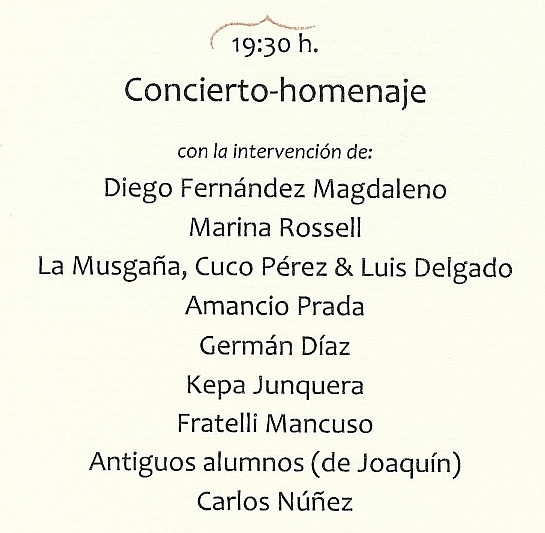 Desde esta modesta «tribuna» no quiero dejar pasar la ocasión de felicitar y agradecer a todos los participantes (Diego Fernández Magdaleno, Marina Rossell, Carlos Beceiro y Jaime Muñoz: La Musgaña, Cuco Pérez, Luis Delgado, Amancio Prada, Germán Díaz, Kepa Junkera, Enzo y Lorenzo Mancuso: Fratelli Mancuso, antiguos alumnos de Joaquín y Carlos Núñez, acompañado a la guitarra de Pancho Álvarez) su presencia en el evento, realzando aún más si cabe el aniversario musical de nuestro protagonista. Y aún no han terminado las celebraciones…
