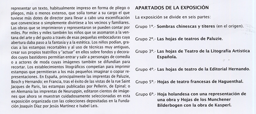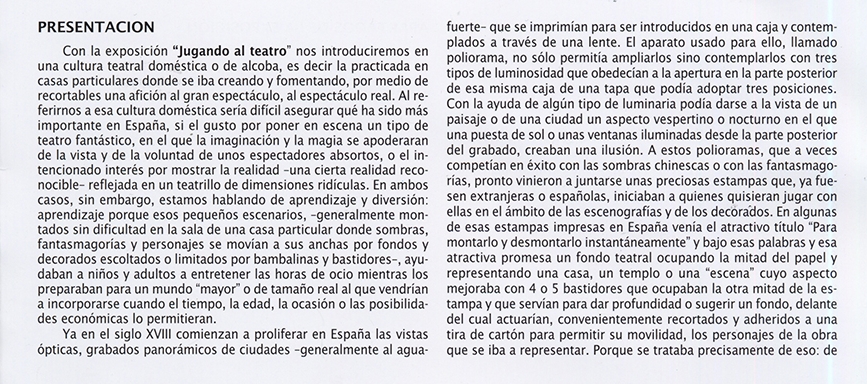 La exposición «Jugando al teatro» reúne ejemplos de una tradición, muy frecuente en los siglos XIX y XX, de fomentar entre los más pequeños la afición al hecho teatral y sus circunstancias. Los niños podían, gracias a las estampas recortables y al uso de técnicas muy antiguas, crear sus propios teatrillos y «actuar» en ellos sobre fondos y decorados cuyos bastidores permitían entrar y salir a personajes de comedia o a actores de moda cuyas imágenes también se difundían para recortar. Los establecimientos litográficos competían para imprimir estampas que permitieran a los niños imaginar o copiar representaciones. En España Paluzie, Bosch y Hernando; en Francia Pellerin, de Epinal, o en Alemania las imprentas de Neuruppin editaron cientos de imágenes que ahora se muestran cuidadosamente seleccionadas en esta exposición.