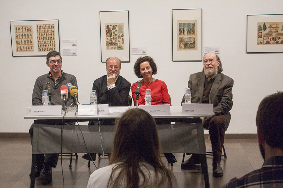 El pasado 8 de abril se inauguró la exposición «Jugando al teatro«, organizada por la Fundación Joaquín Díaz y de la que son comisarios Joaquín Díaz y Jesús Martínez-Leis. En la siguiente fotografía, cortesía de Juan Bosco Hormaechea, podemos ver a ambos junto a Francisco Javier León de la Riva, alcalde de Valladolid, y Mercedes Cantalapiedra Álvarez, Concejala de Cultura de dicho ayuntamiento, durante la rueda de prensa que tuvo lugar el mencionado día.