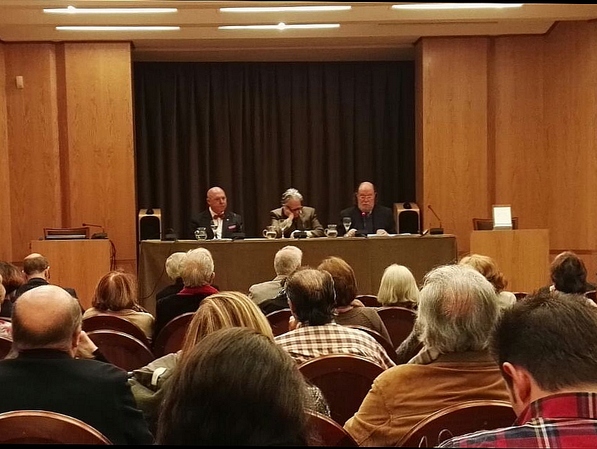 De izquierda a derecha: Ismael Fernández de la Cuesta, Fernando de Terán (Vicedirector y Director, respectivamente, de la Real Academia de San Fernando), Joaquín Díaz y Fernando Gomarín (editor de «La Huerta Grande«). Más información sobre la intervención de Joaquín en el evento pinchando aquí.
