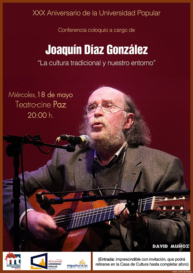 En el contexto de las actividades conmemorativas del 30 aniversario de la Universidad Popular de Miguelturra (Ciudad Real) el pasado miércoles 18 de mayo tuvo lugar en el Teatro Cine Paz de dicha localidad la conferencia coloquio «La cultura tradicional y nuestro entorno«, a cargo de Joaquín Díaz.