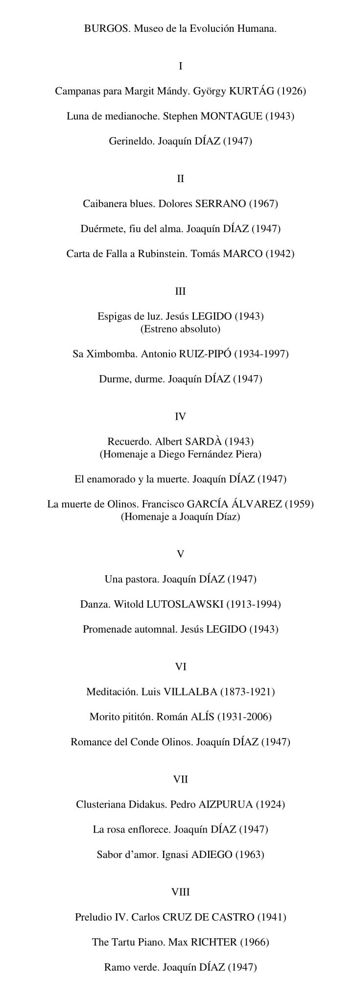 El Museo de la Evolución Humana de Burgos fue escenario el pasado sábado 24 de marzo de 2018 de un nuevo homenaje a Joaquín Díaz: “La voz de la memoria”, recital de piano de Diego Fernández Magdaleno. El contenido y estructura del recital -organizado sobre la base de ocho bloques, como puede verse sobre estas líneas- fue relativamente similar a los que tuvieron lugar en febrero de 2018 en la Sala de Cámara del Centro Cultural Miguel Delibes de Valladolid y en julio de 2017 en la Real Academia de Bellas Artes de San Fernando de Madrid, sobre los que informamos en su momento (pincha aquí o acá para acceder a los contenidos correspondientes).