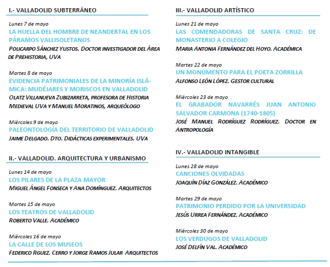 Entre los cometidos que tiene asignados la Real Academia de Bellas Artes de la Purísima Concepción se encuentra la defensa del patrimonio artístico de Valladolid y su provincia. Para ello, uno de los mejores instrumentos de que dispone es mantener su carácter pedagógico contribuyendo a la difusión de su conocimiento. Con este propósito inició en 2007 el programa de cursos Conocer Valladolid, dedicado a divulgar los recursos históricos y artísticos del entorno vallisoletano, para que puedan ser debidamente valorados por todos.