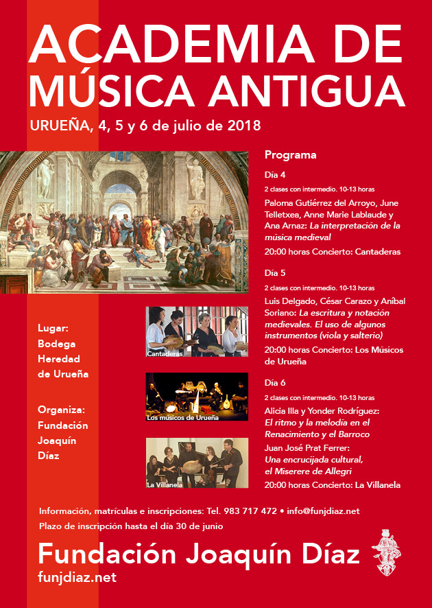 Por otra parte, los próximos días 4, 5 y 6 de julio, la bodega Heredad de Urueña será la sede de un nuevo simposio («Academia de Música Antigua«) organizado por la Fundación Joaquín Díaz, con la colaboración de la Consejería de Cultura y Turismo de la Junta de Castilla y León, Diputación de Valladolid, Bodega Heredad de Urueña y Cátedra de Estudios sobre la Tradición (matrícula 30 euros e inscripciones hasta el 30 de junio: info@funjdiaz.net / 983-717472). Adjuntamos a continuación el programa del mismo.