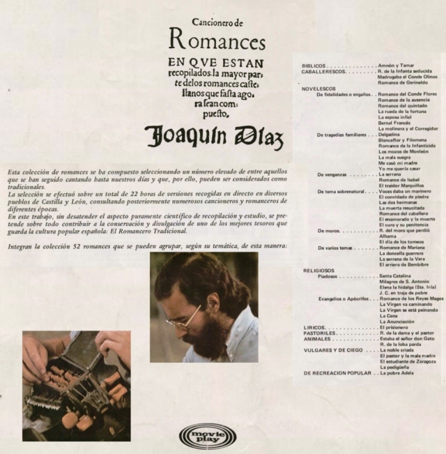 Sin duda uno de los trabajos más especiales y característicos en la trayectoria discográfica de Joaquín Díaz. Movieplay edita en 1978 «Cancionero de Romances«, colección de cincuenta y dos romances organizados en cinco vinilos y agrupados, según su temática, en bíblicos, caballerescos, religiosos (piadosos y evangelios), líricos, pastoriles, animales, vulgares y de ciego, de recreación popular y novelescos. Estos últimos son, a su vez, de varios tipos: de fidelidades o engaños, de tragedias familiares, de venganzas, de tema sobrenatural, de moros y de varios temas.