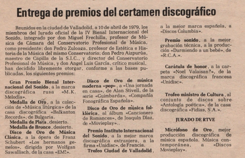 En el siguiente recorte de prensa, cuya procedencia lamentablemente no podemos precisar, se hace referencia al premio obtenido por «Cancionero de Romances» en el contexto de la IV Bienal Internacional del Sonido celebrada en Valladolid en 1979. Consigue el «Disco de Oro de música folklórica«.