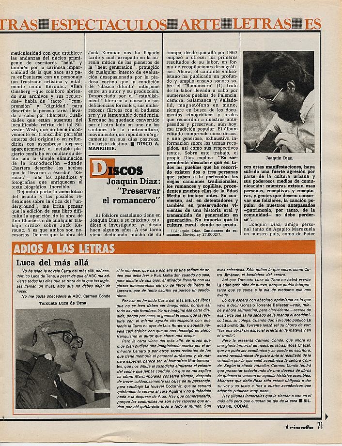 El número 792 de la revista Triunfo, publicado el 1 de abril de 1978, incorpora entre sus páginas un breve artículo sobre «Cancionero de Romances«, incluyendo algunas interesantes apreciaciones de Joaquín sobre el mismo. Ya dedicamos una publicación del blog a este documento (pincha en este enlace para acceder), pero lo recuperamos también aquí.
