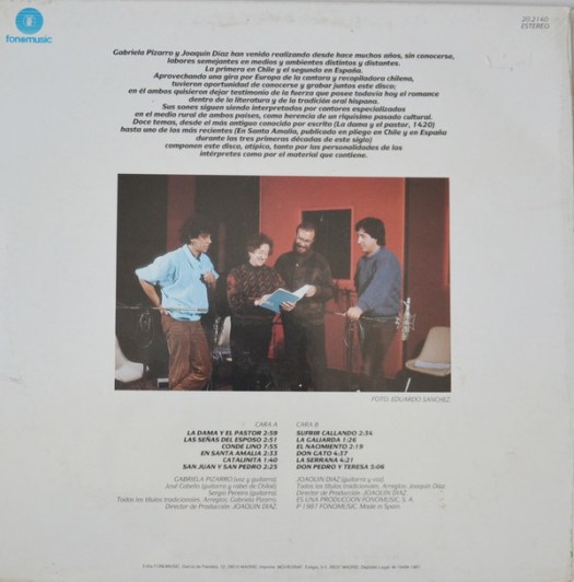 «Gabriela Pizarro y Joaquín Díaz han venido realizando desde hace muchos años, sin conocerse, labores semejantes en medios y ambientes distintos y distantes. La primera en Chile y el segundo en España. Aprovechando una gira por Europa de la cantora y recopiladora chilena, tuvieron oportunidad de conocerse y grabar juntos este disco; en él ambos quisieron dejar testimonio de la fuerza que posee todavía hoy el romance dentro de la literatura y de la tradición oral hispana. Sus sones siguen siendo interpretados por cantores especializados en el medio rural de ambos países, como herencia de un riquísimo pasado cultural. Doce temas, desde el más antiguo conocido por escrito (La dama y el pastor, 1420) hasta uno de los más recientes (En Santa Amalia, publicado en pliego en Chile y en España durante las tres primeras décadas de este siglo) componen este disco, atípico, tanto por las personalidades de los intérpretes como por el material que contiene».