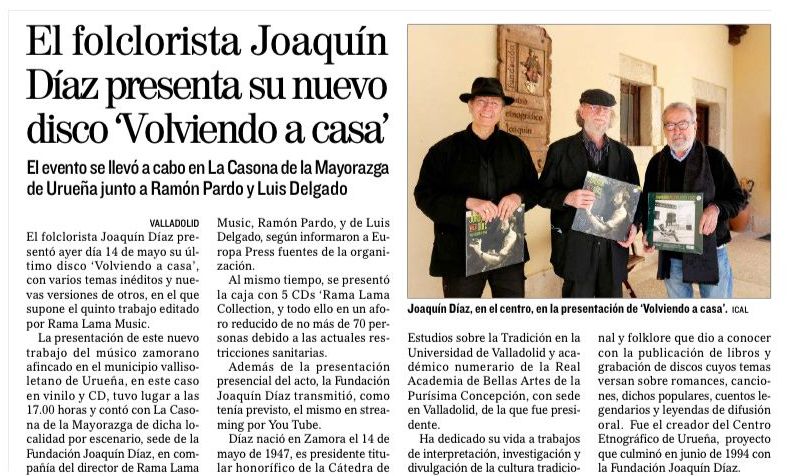 «Volviendo a casa«, el nuevo trabajo de Joaquín Díaz, fue presentado oficialmente el pasado viernes 14 de mayo de 2021 en la sede de la Fundación Joaquín Díaz (Urueña, Valladolid), coincidiendo con el cumpleaños de nuestro protagonista. Tiene la particularidad de incluir varios temas inéditos, así como nuevas versiones de otros, fruto del hallazgo de una serie de grabaciones caseras registradas a finales de los años 60 en casa de unos amigos de Joaquín (Luis de la Fuente y Elena Casuso).