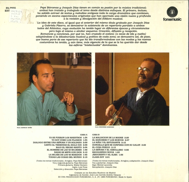 Son dieciocho los temas incluidos en este trabajo, segundo de la colección «Romances de Allá y de Acá» de la que ya hablamos semanas atrás (pincha aquí para acceder a la información previa), interpretados a partes iguales entre Joaquín Díaz y el peruano Pepe Bárcenas.