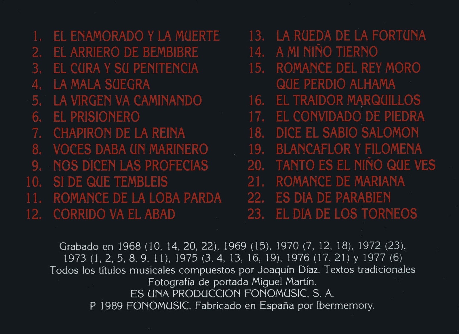 No puede ser más certero el título de este disco, recopilatorio publicado por Fonomusic en 1991 que incluye 23 temas -extraídos de nueve de sus obras previas- con música compuesta por Joaquín Díaz. Incluimos a continuación el listado de canciones, anotando entre paréntesis el trabajo del que proceden y su año de publicación: