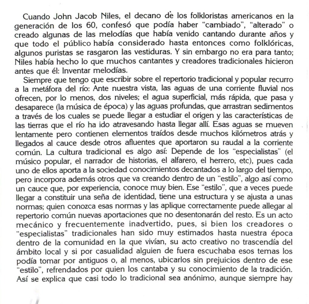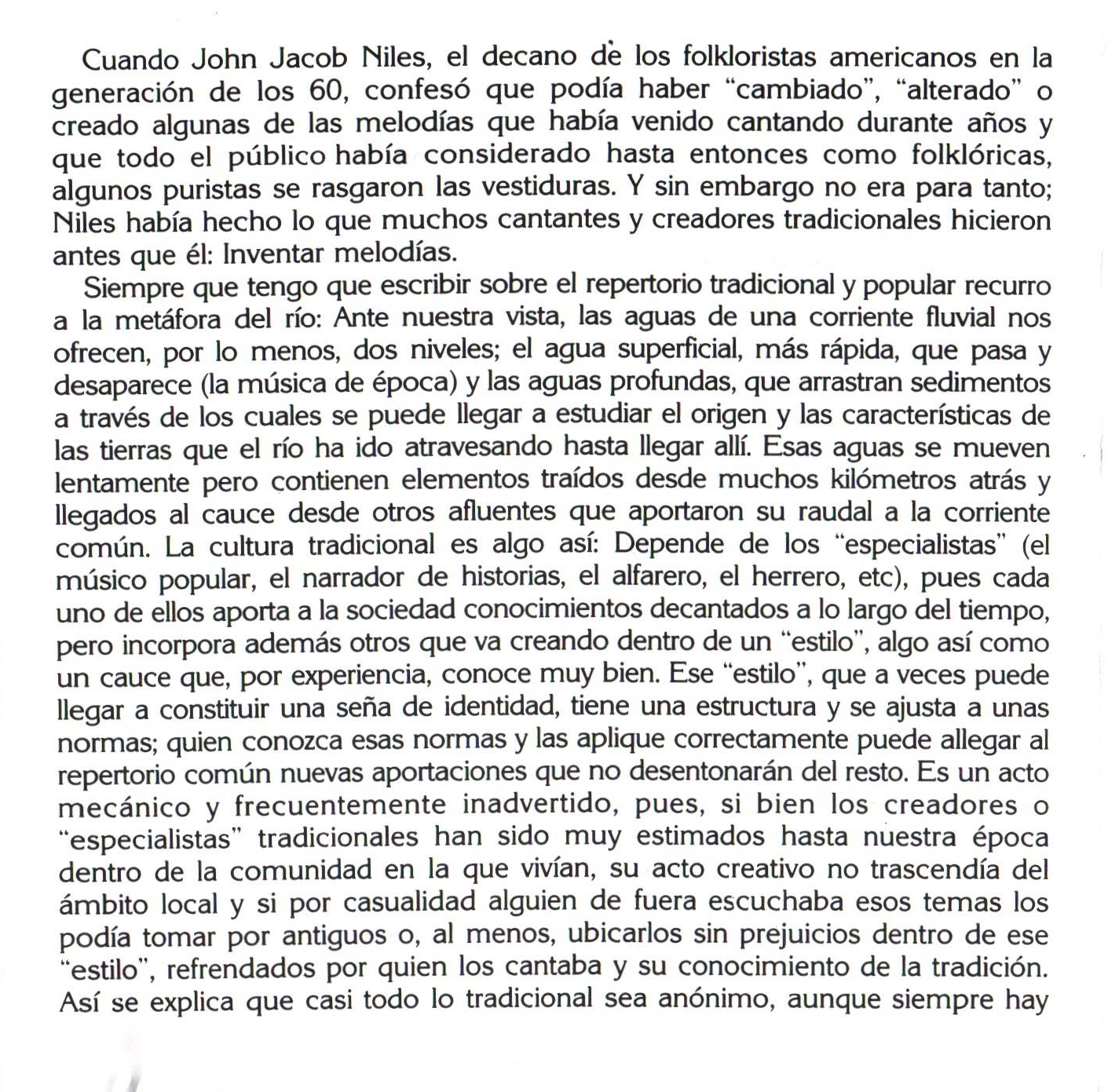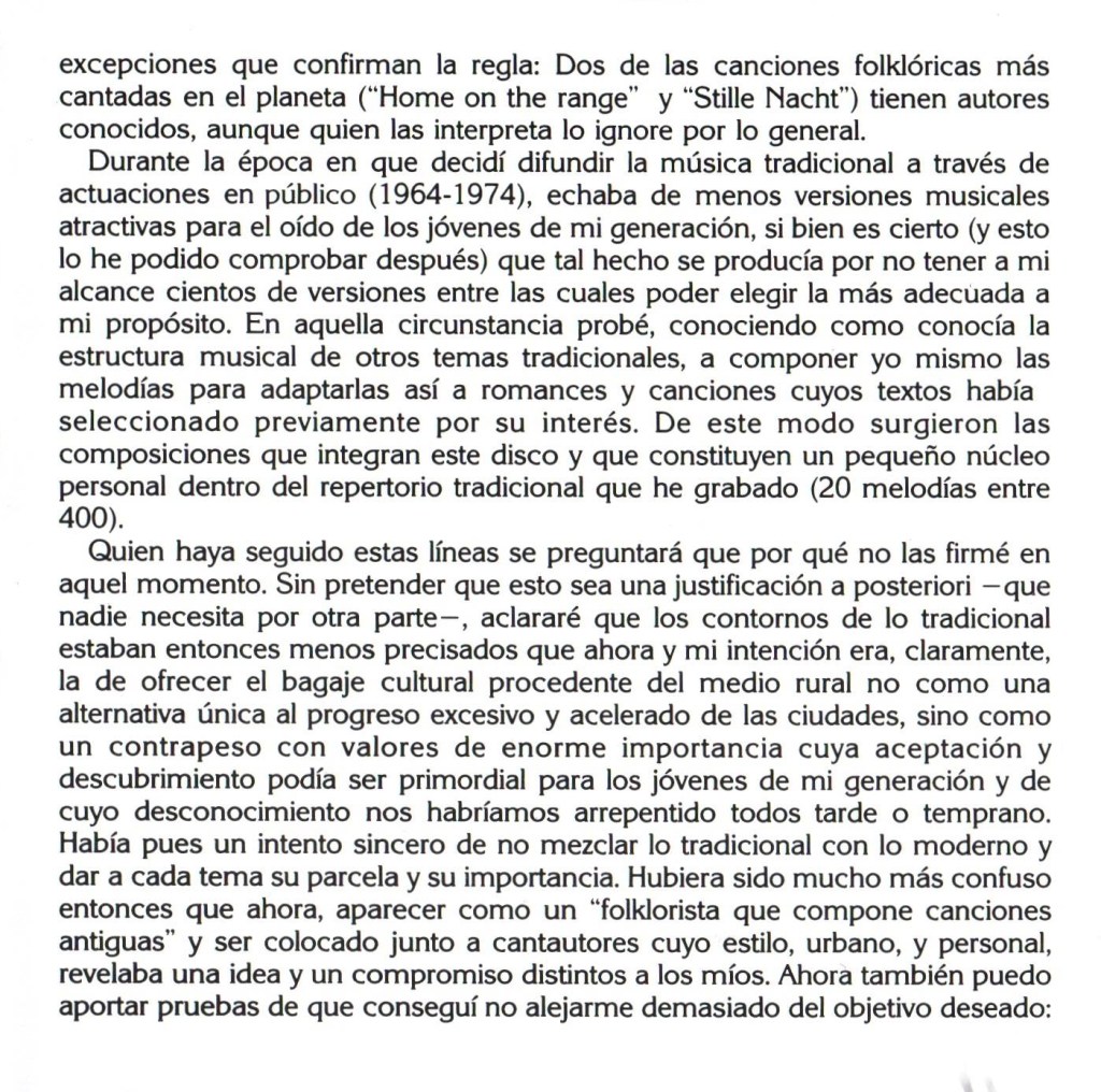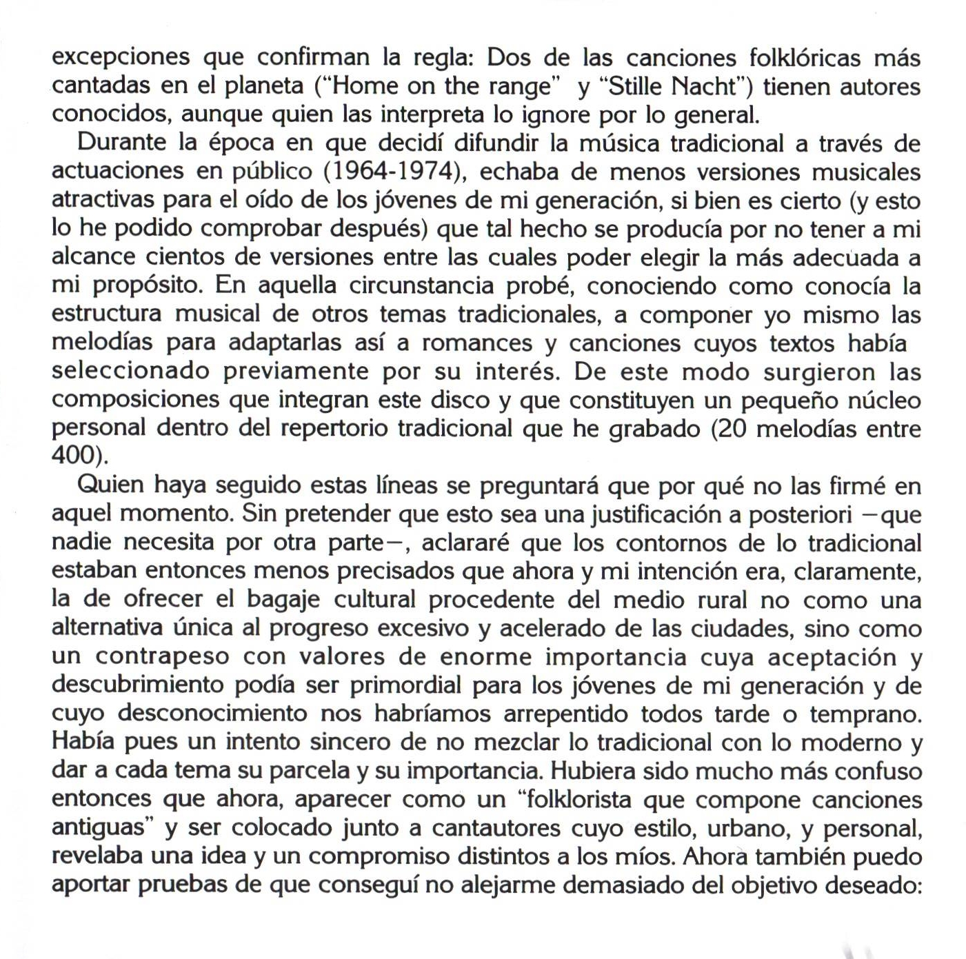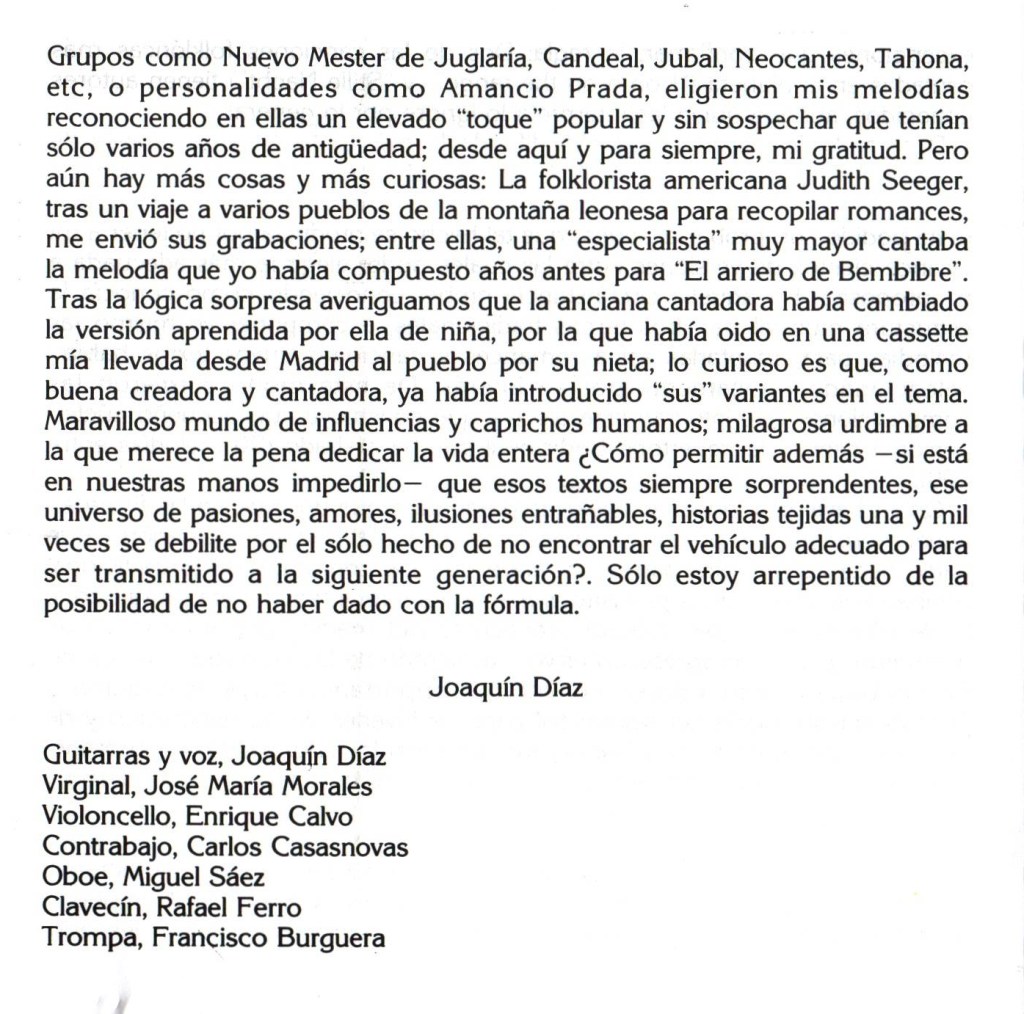 Joaquín Díaz firma un interesante texto -incluido en el libreto que acompaña al disco- en el que, tras señalar que muchos cantantes y creadores tradicionales crearon/inventaron melodías, pone de manifiesto las razones por las que también él lo hizo, así como los motivos por los que no firmó sus composiciones hasta muchos años después. Podéis acceder al contenido a continuación (pincha en las imágenes para aumentar su tamaño):