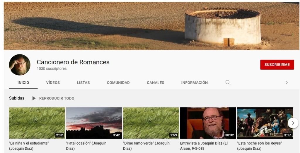 Cerca ya de cumplirse la primera década de existencia de «Cancionero de Romances» nos referimos hoy, por vez primera, al canal de Youtube asociado al blog (podéis ver su pantalla de presentación sobre estas líneas). Con su mismo nombre, e idéntica filosofía, nació exactamente el 22 de noviembre de 2012 y se configura como un repositorio donde se almacenan todos los contenidos audiovisuales que a lo largo del tiempo hemos ido publicando. Os indico a continuación su «puerta de entrada» directa, aunque también podéis acceder desde uno de los menús de la web («blogroll»). Recuerdo, en este sentido, que tenéis a vuestra disposición dichos menús pinchando sobre las tres rayas horizontales ubicadas en la esquina superior derecha.
