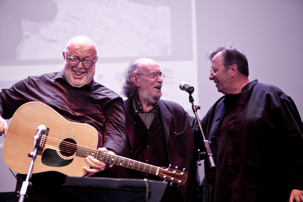 Continuó e incluso se amplificó la magia en el Filarmónica. Todos los artistas salieron al escenario, acompañando a Paco Ibáñez mientras cantaba su particular cumpleaños feliz a Joaquín. Resulta curioso y muy emocionante ver interactuar a dos mitos.