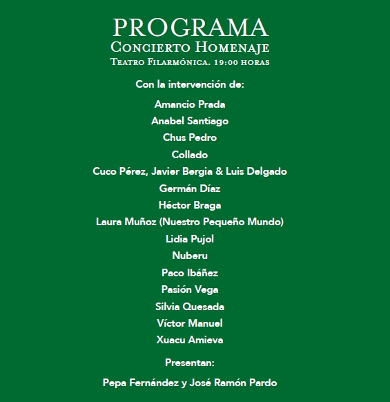 Por allí, presentados por Pepa Fernández y José Ramón Pardo, pasaron entre otros muchos, el ya mencionado Víctor Manuel, Luis Delgado, Pasión Vega, Amancio Prada, Chus Pedro, Anabel Santiago y Paco Ibáñez. Todo un éxito de sentimientos y emociones dentro de una variedad increíble de registros. Magnéticos sonaron algunos cantos del repertorio del homenajeado y, también, del de los restantes artistas. Una noche inolvidable y de la que se hablará durante años, en justo reconocimiento al legado de Joaquín y a la intensidad con que todos los artistas expresaron su talento en forma de belleza.