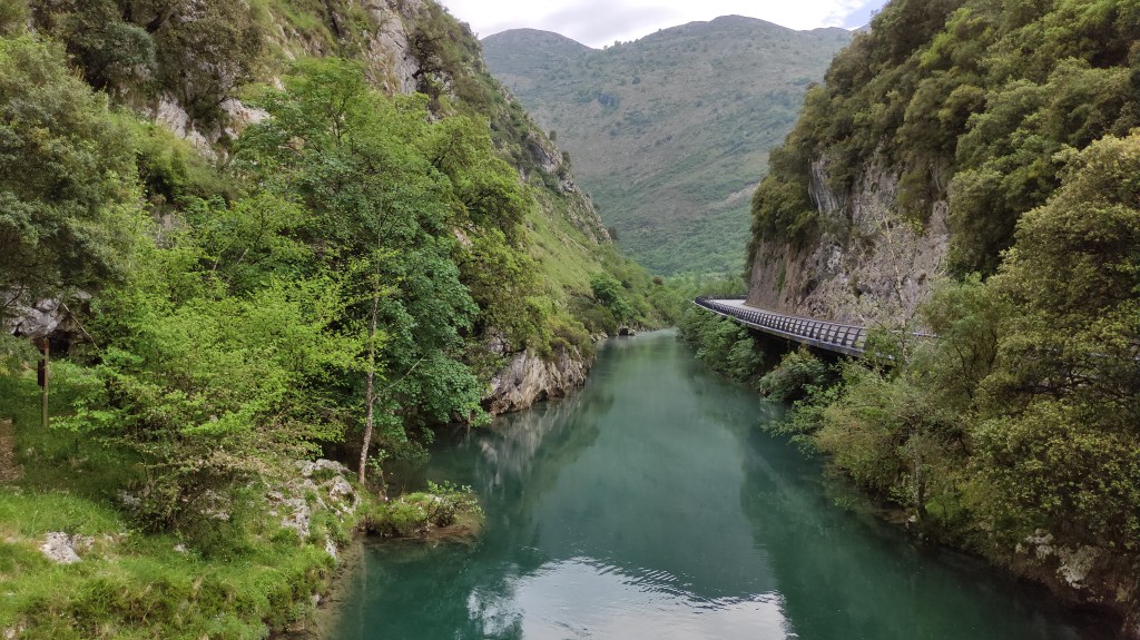 La comida posterior, en el cercano restaurante Casa Julián, permitió disfrutar de la espectacular gastronomía local, así como de unas maravillosas vistas, colgados literalmente sobre el embalse Niserias y el río Cares. Llueve con fuerza mientras dedicamos a Joaquín un vigoroso «cumpleaños feliz», probable causa del repentino cambio meteorológico.