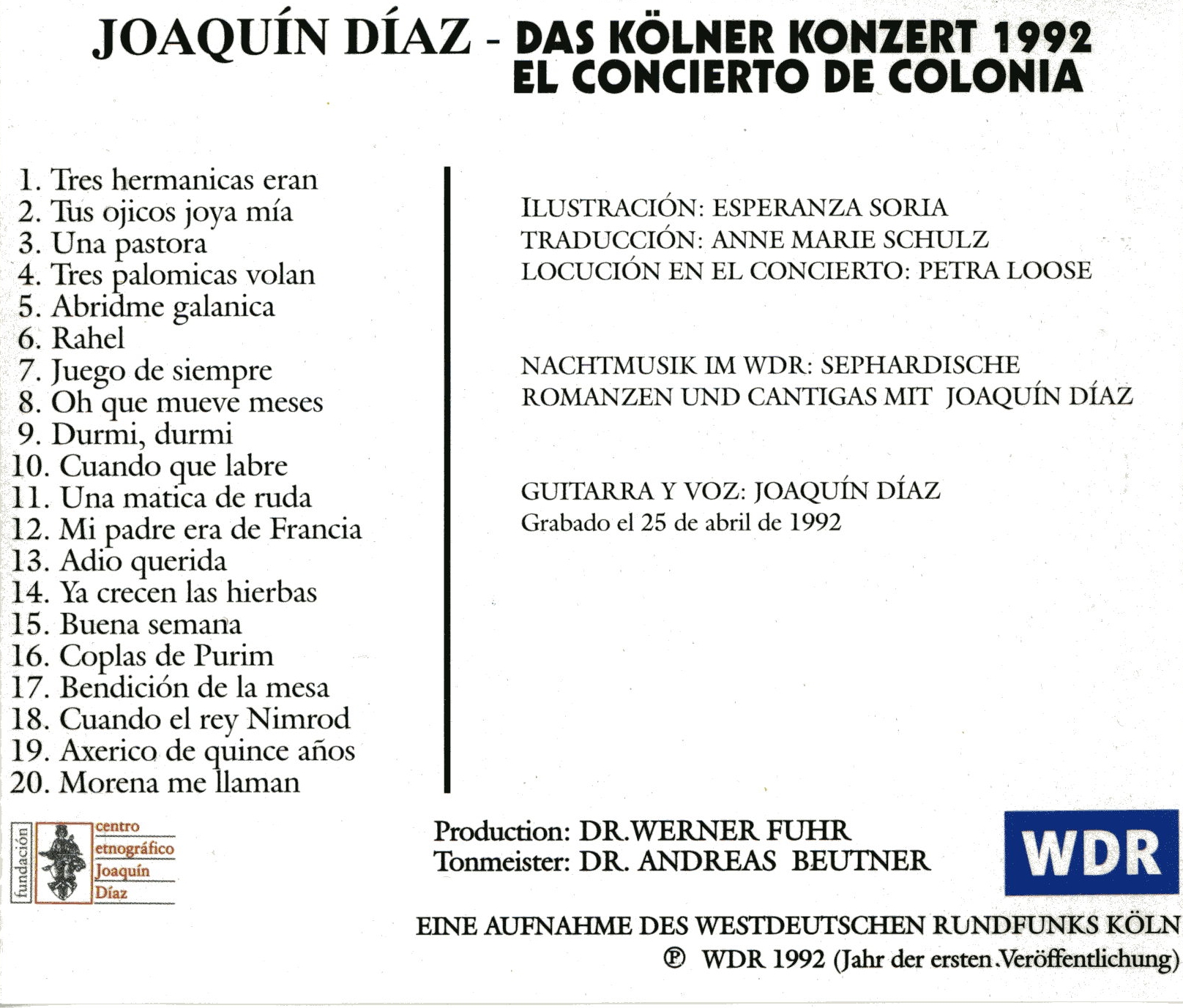 Son veinte los temas incluidos en este trabajo de Joaquín Díaz, producido por Werner Fuhr y editado en 1992 por la WDR (empresa alemana de radio y televisión pública que presta servicio a Renania del Norte-Westfalia). Andreas Beutner es el técnico de sonido de una grabación en directo realizada en la Grosser Sendesaal de la mencionada WDR, siendo Joaquín el único responsable a nivel instrumental (voz y guitarra). Destacamos que Igor Stravinsky dirigió el concierto inaugural de esta sala de emisión el 8 de octubre de 1951.