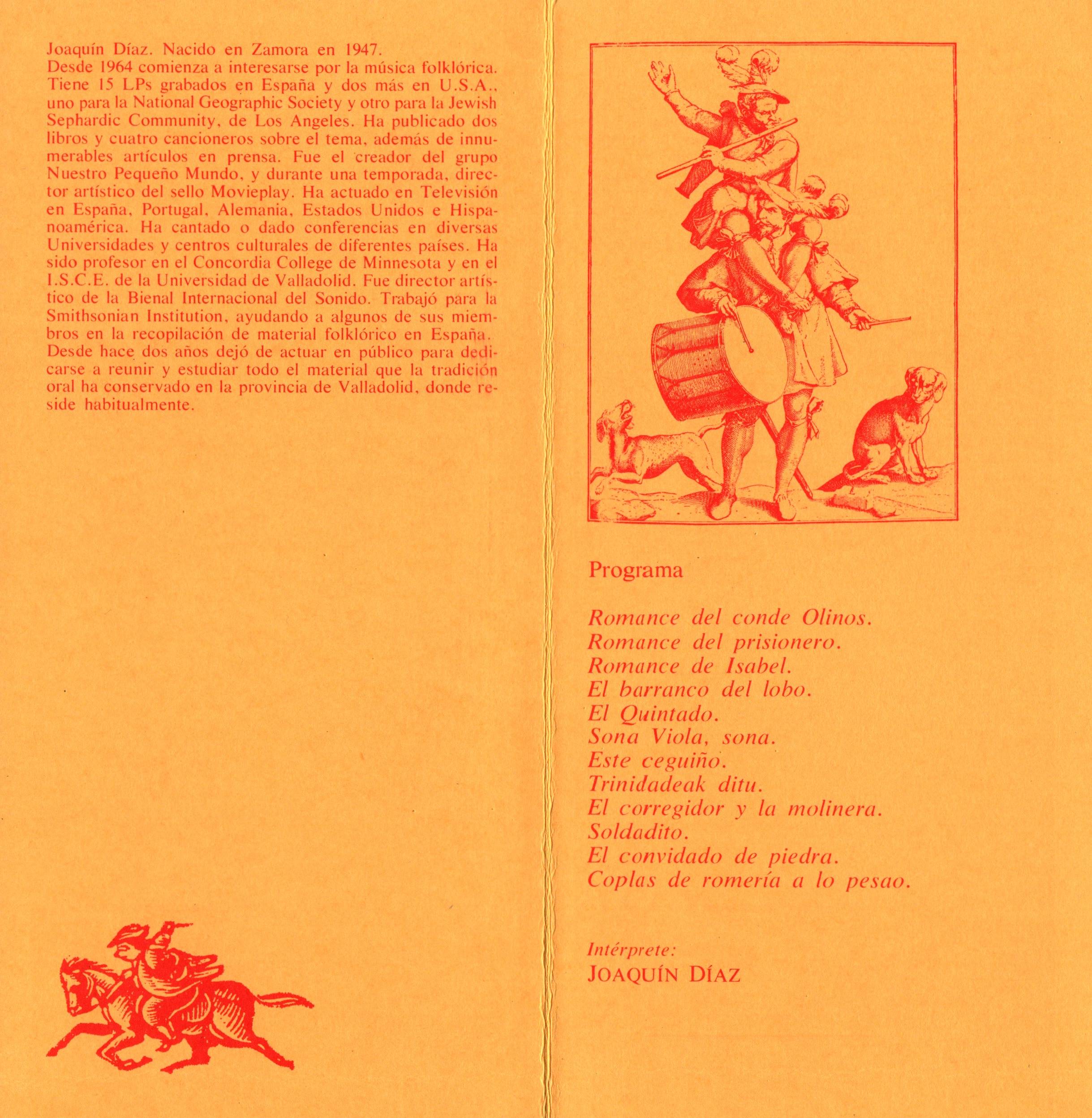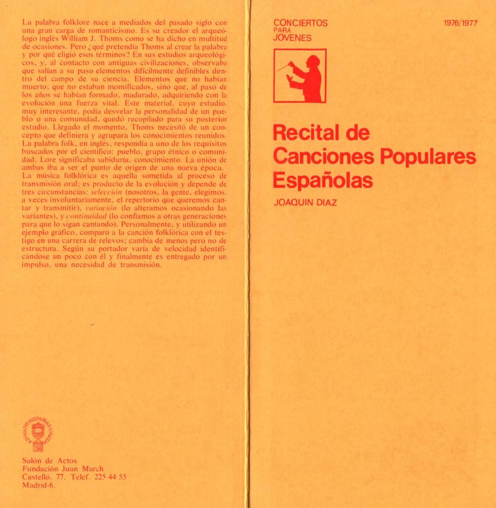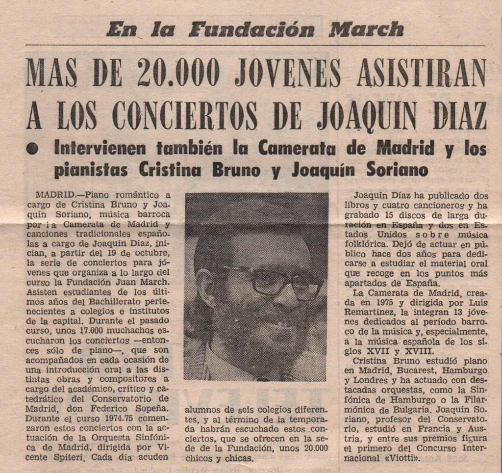 Os ofrecemos, para finalizar, dos interesantes documentos: el programa del recital editado por la Fundación Juan March (incluyendo el repertorio ofrecido por Joaquín Díaz), así como la noticia sobre el ciclo «Conciertos para jóvenes» publicada en prensa (lamentablemente no podemos aportar datos sobre el periódico ni fecha de publicación).
