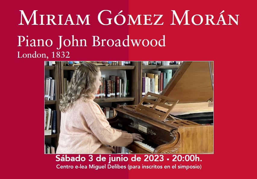 20:00 horas ● Concierto en el centro e-Lea Miguel Delibes (para inscritos en el simposio). Miriam Gómez Morán (Piano John Broadwood, London, 1832. Colección «Serrato». Instrumento construido por John Broadwood en 1832 en Londres).