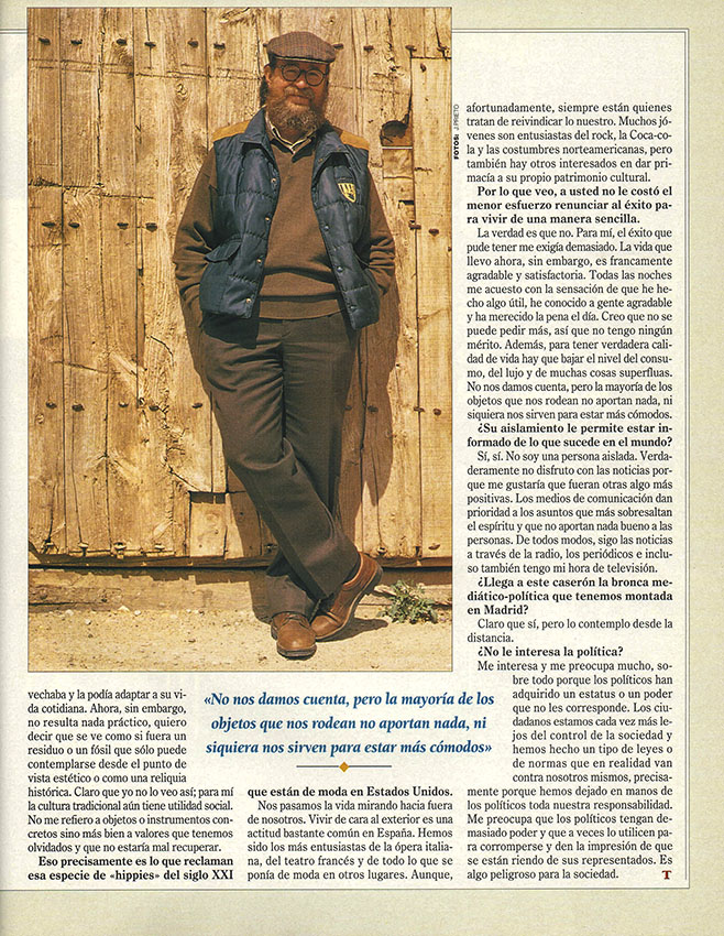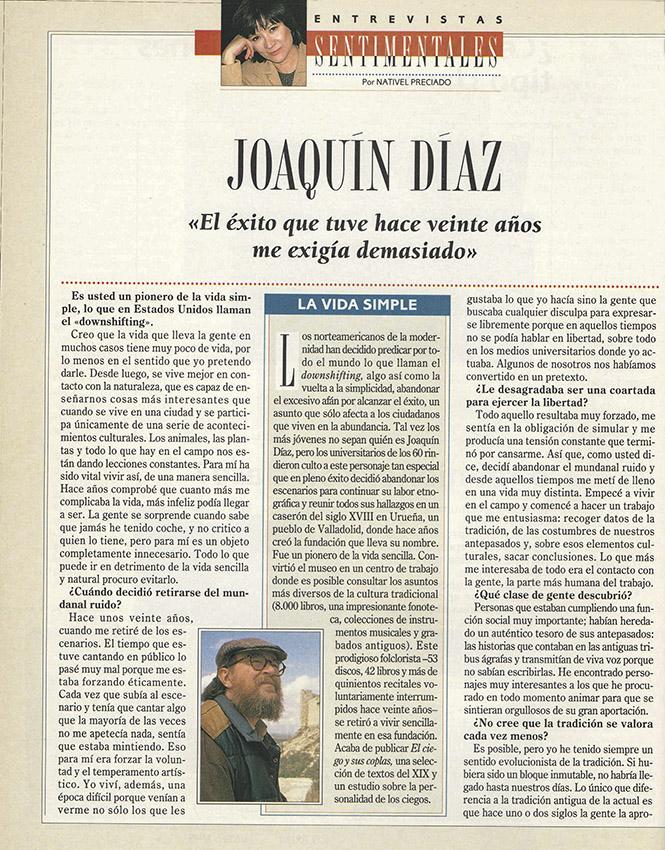 Javier Prieto Gallego, periodista y fotógrafo independiente, realizó un reportaje gráfico de Joaquín Díaz en 1997 para Tiempo, revista semanal de actualidad publicada en España entre 1982 y 2018. Las fotografías sirvieron para acompañar una estupenda entrevista de Nativel Preciado hablando, por ejemplo, de por qué en un momento determinado Joaquín decidió dejar los escenarios en un lugar secundario para dedicarse a la investigación. Vemos por encima y por debajo de estas líneas tres de esas imágenes, que quedan integradas en la sección «Galería fotográfica«.