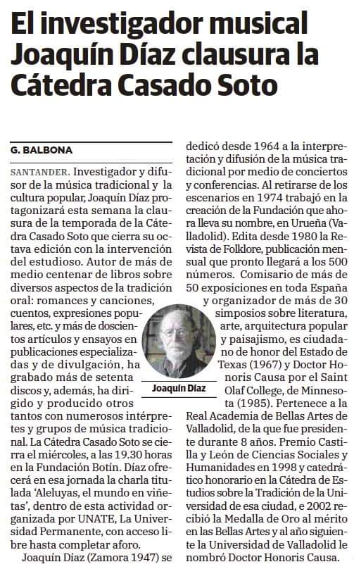 Finalizamos la publicación con dos de las noticias aparecidas en prensa sobre la conferencia ofrecida por Joaquín Díaz.