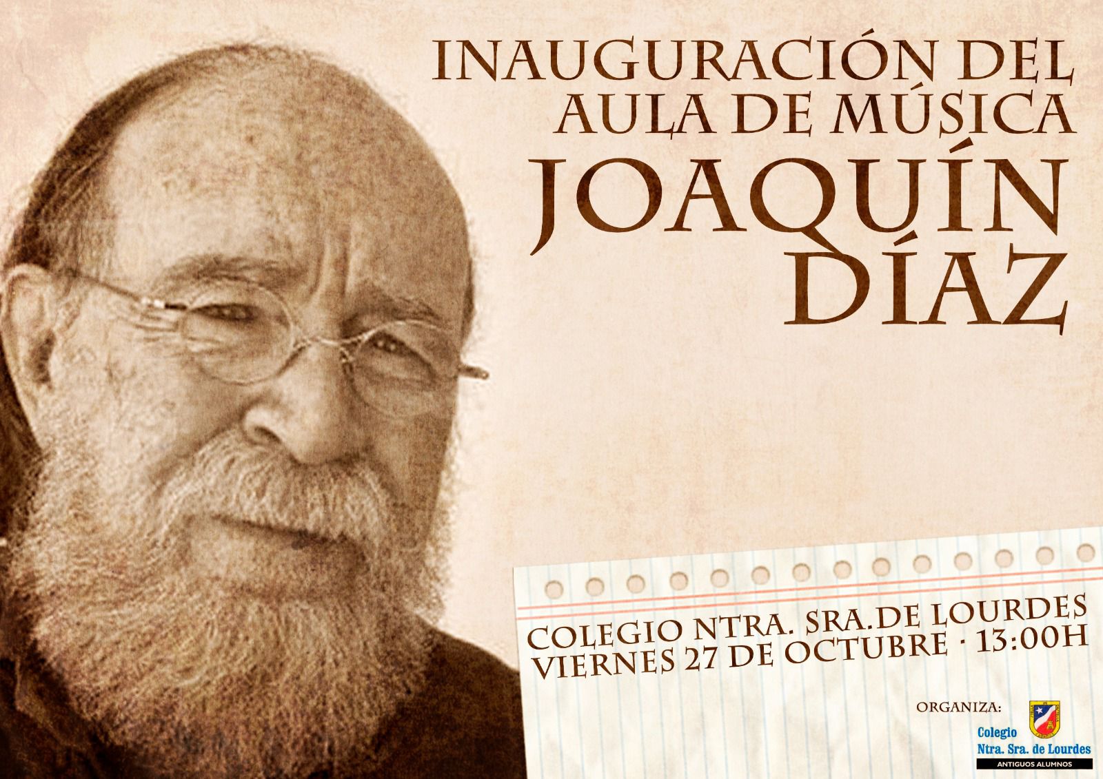 El colegio Nuestra Señora de Lourdes inauguró el viernes 27 de octubre de 2023 la remodelada Aula de Música del Colegio, en las antiguas Escuelas Gratuitas, que dedica a Joaquín Díaz, antiguo alumno del centro. La iniciativa partió de la Asociación de Antiguos Alumnos del Lourdes y participaron en ella los alumnos de segundo curso de la ESO, con su profesora de música Inés Moncada Monedero, así como el también músico y antiguo alumno Javier Vielba.