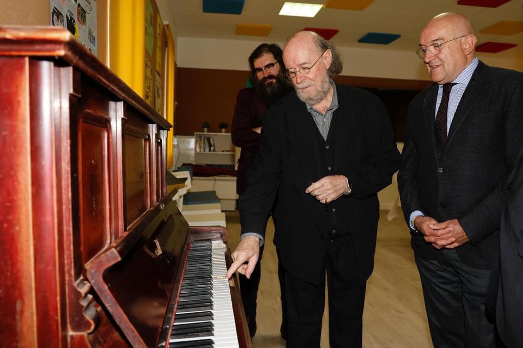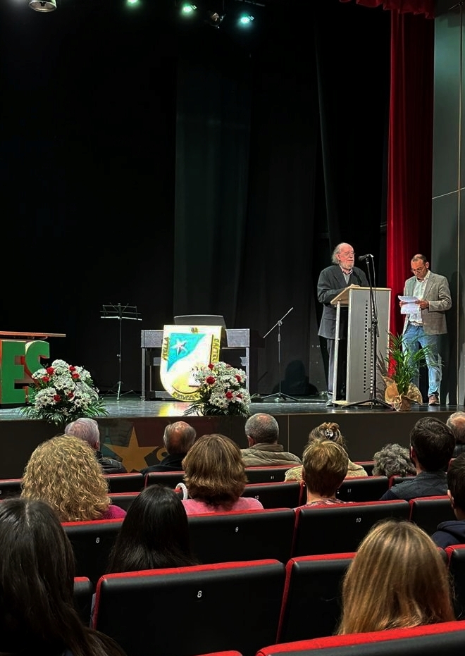 En el Teatro del centro se celebró un sencillo acto, donde la música fue la protagonista, con palabras cariñosas y sentidas hacia Joaquín Díaz por parte de Javier Burrieza, presidente de la Asociación de Antiguos Alumnos del centro.