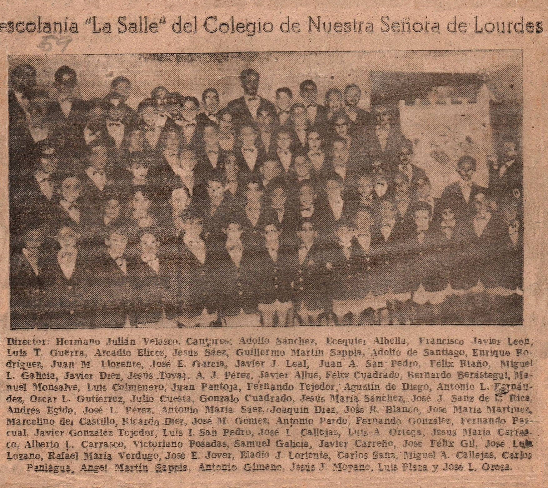 Cerramos la entrega de hoy con un interesantísimo documento. Se trata de una fotografía publicada en 1959, no podemos confirmar si en El Norte de Castilla o en el Diario Regional, cuando Joaquín contaba con 12 años, en la que vemos a los componentes de la Escolanía «La Salle» del Colegio Nuestra Señora de Lourdes, incluyendo por supuesto a nuestro protagonista. La calidad de la foto no es nada buena, pero… ¿sois capaces de localizarle?