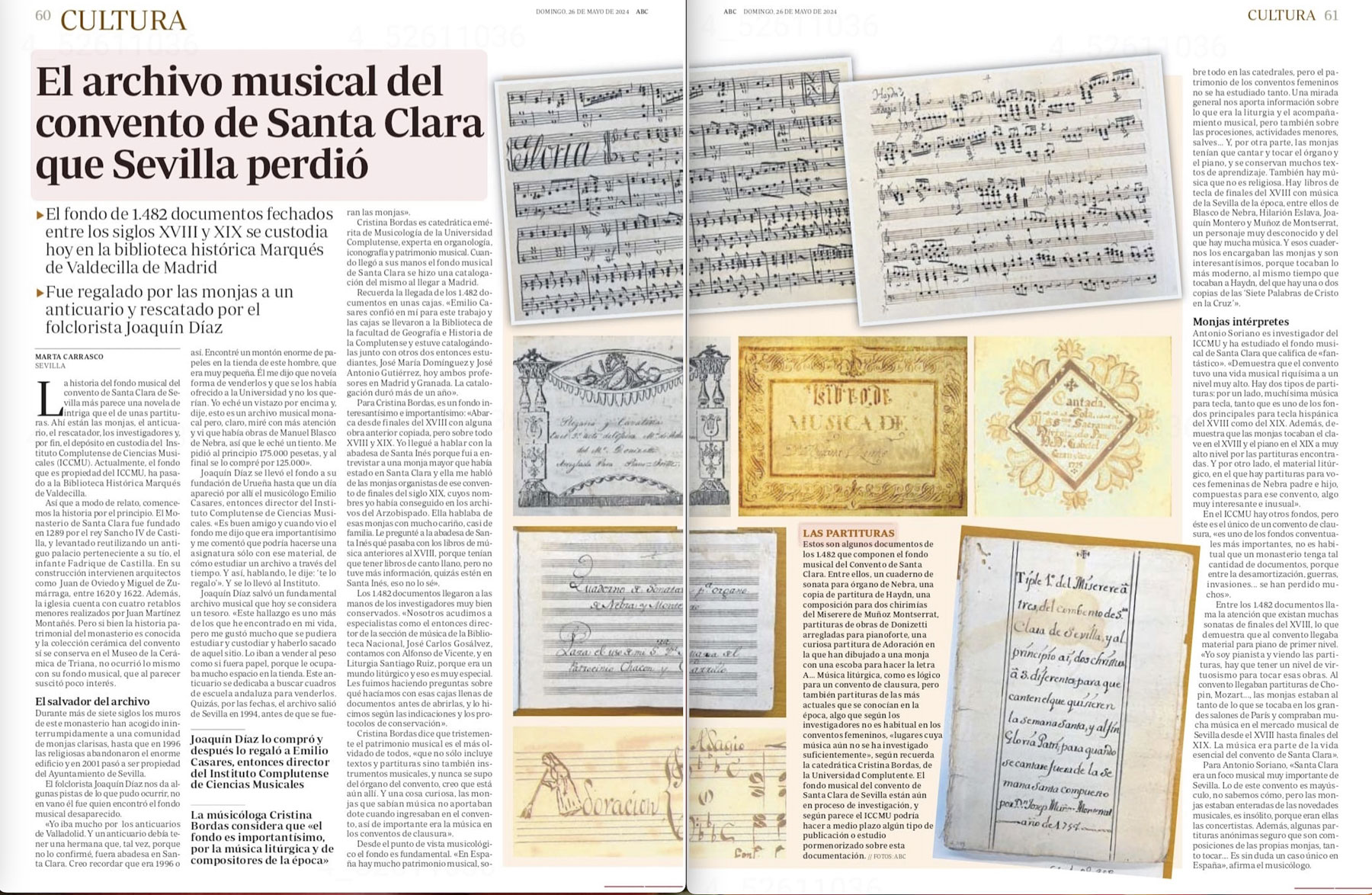 La sección cultural del periódico ABC dedicó su edición del pasado 26 de mayo de 2024 a la curiosa -incluso rocambolesca- historia del archivo histórico musical del convento de las Claras de Sevilla. Se trata de un conjunto de 1.482 documentos musicales, en su mayor parte manuscritos de música religiosa, fechados entre mediados del siglo XVIII y finales del XIX, en cuya conservación tiene mucho que ver Joaquín Díaz.