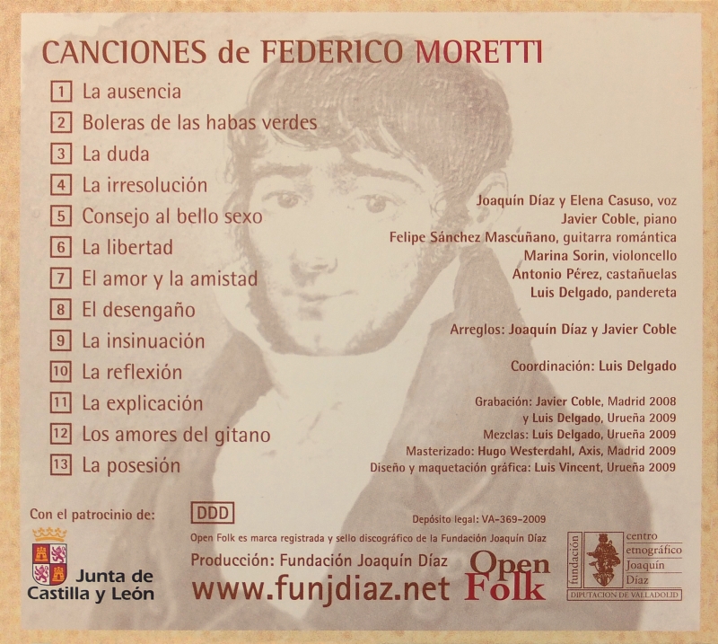 El hallazgo hace ya varios años de unas partituras en el sobrado de la casa de un pueblo de Valladolid, que servían como forro a un libro de Ovidio salido de la imprenta que los jesuitas tenían en su histórico colegio y noviciado de la población vallisoletana de Villagarcía de Campos, permitieron a Joaquín Díaz rescatar y grabar un repertorio representativo del compositor y violonchelista italiano del siglo XIX Federico Moretti.