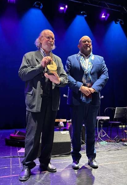 Hizo entrega del galardón el Alcalde de Yepes, Tomás Arribas Ruiz, a quien vemos junto a Joaquín en la imagen situada sobre este párrafo, en presencia de Juan Rodríguez-Tembleco, del grupo Aljibe, anfitrión de la velada.