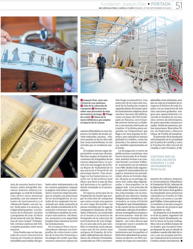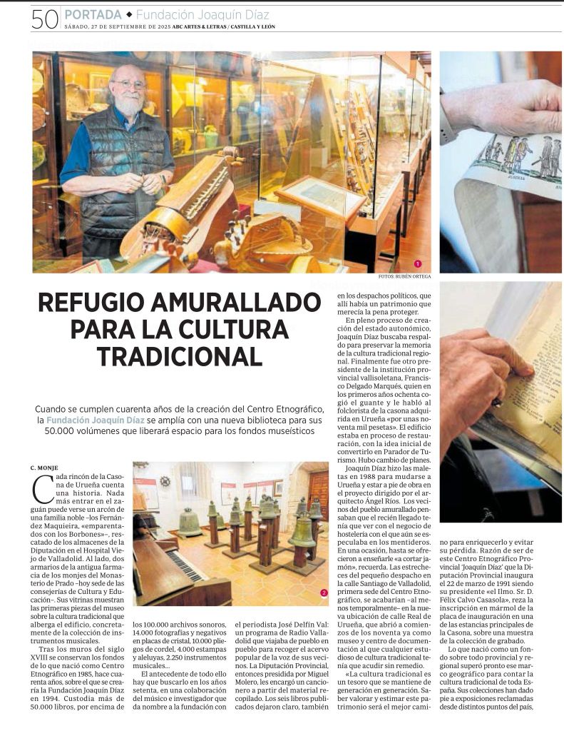 Cuando se cumplen cuarenta años de la creación del Centro Etnográfico, la Fundación Joaquín Díaz se amplía con una nueva biblioteca para sus 50000 volúmenes que liberará espacio para los fondos museísticos. Éste es el tema principal en el que se centra el reportaje publicado el pasado 27 de septiembre en el suplemento ABC Artes & Letras, que ponemos a vuestra disposición a continuación.