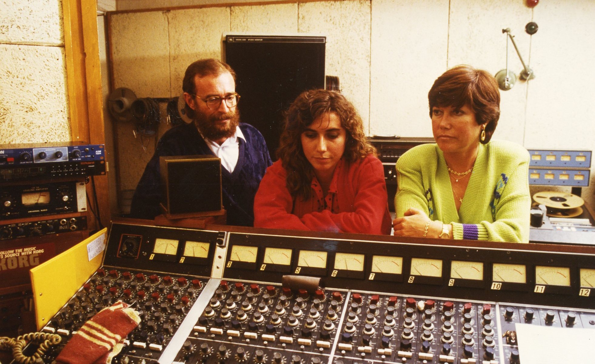 Con Sonia de la Fuente y Elena Casuso escuchando en el control del estudio una grabación.